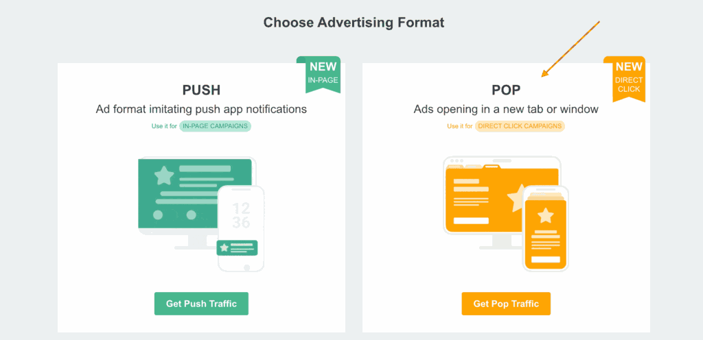 1. After registering in the ROIads ad dashboard, select the pop format at the campaign creation stage.