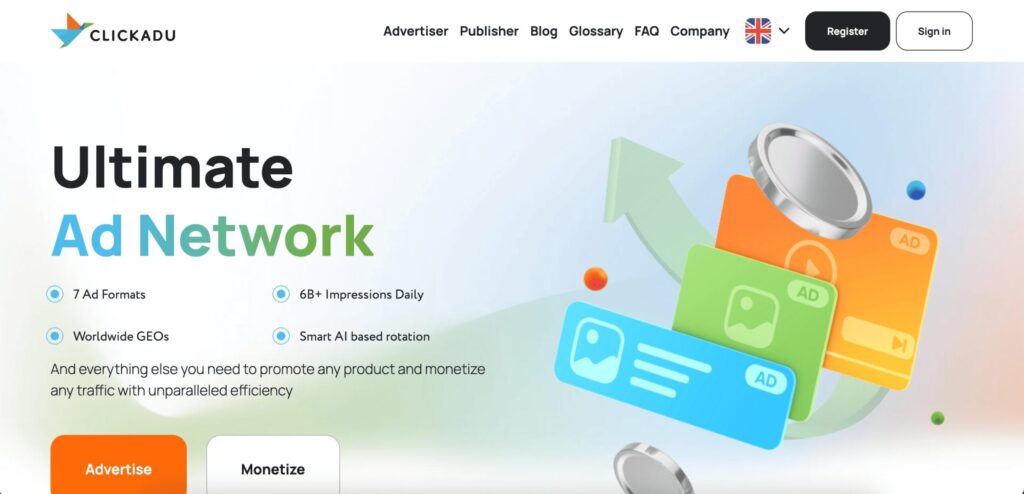 ClickAdu has steady volumes and fast approvals, good for broad testing and scaling. Simple interface and many placements to run multi-format ad campaigns without switching networks.