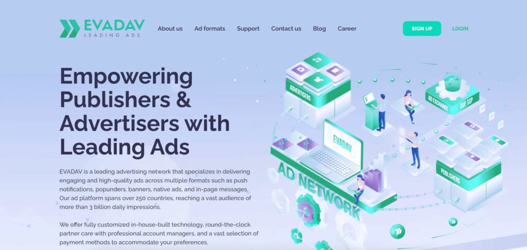 Evadav is a push and in-page push network with native inventory. Focuses on Tier-2 and Tier-3 geos and is often used for dating, utilities, sweepstakes and mobile apps. Simple and good for small to mid-size budgets.