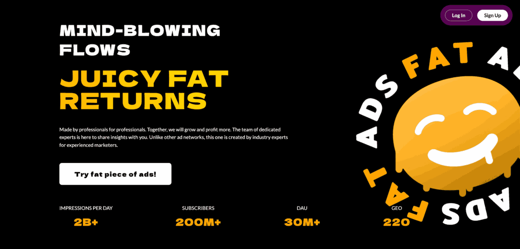 FatAds is a push and pop network with strong coverage in Tier-2 and Tier-3 geos. It’s used for gambling, betting, dating, sweepstakes, utilities and mobile offers. The ad platform is straightforward: fast approvals, clean interface and stable daily volumes.