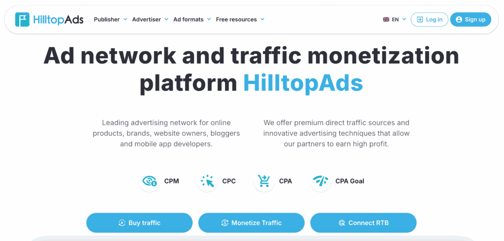 | HilltopAds | Popunder, In-Page, Banner, Video | Global (Tier-2/3 focus) | $50 | Affordable entry, steady lower-tier traffic |