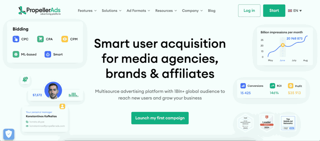 PropellerAds is a large self-serve network with global traffic and steady daily volumes. It offers popunder, push notifications, in-page push, interstitials and survey exit formats. It’s often used for testing wide geos because it delivers consistent reach and fast moderation.