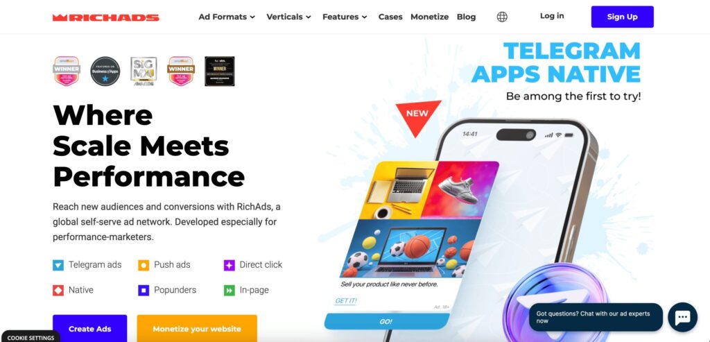 - Ad Formats: Push, In-Page Push, Popunder, Native, Direct Click, Telegram