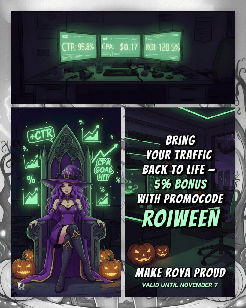 Deposit any amount at ROIads and grab an extra 5% bonus with the promo code ROIWEEN.
