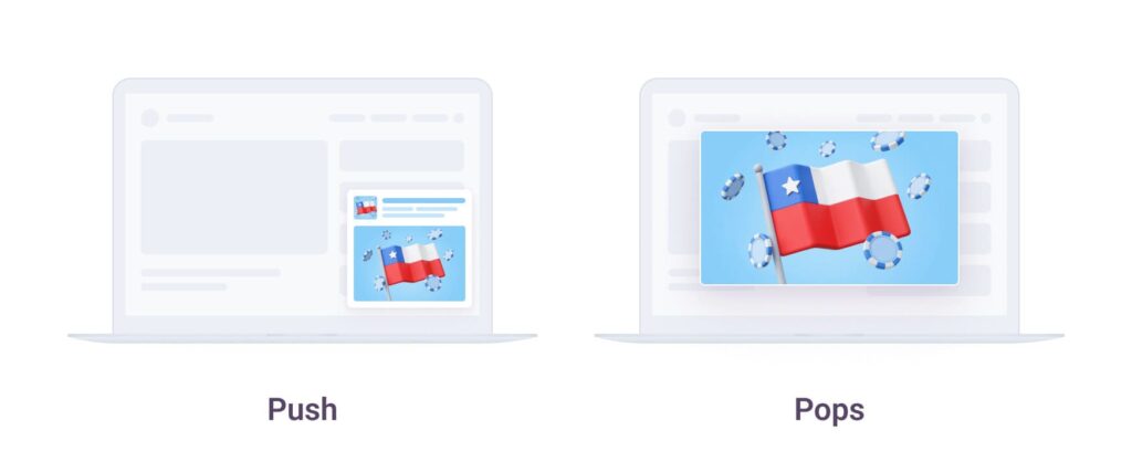 Here, the best results usually come from formats with no targeting restrictions — primarily push traffic & pop ads. These formats let affiliates access casino traffic in Chile and betting traffic in Chile efficiently, without having to rely on 3rd party approval systems.