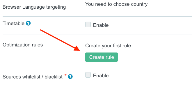 In push campaigns rules help to automate traffic testing and creative management. For example you can pause low CTR creatives, block devices with high CPA or limit spend during tests. Just open Advanced settings → Optimization rules → Create rule, set conditions and the system will do the work for you.