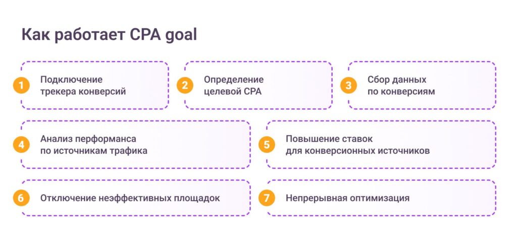 CPA goal работает на основе данных по конверсиям из трекера. Арбитражник задает желаемую цену за конверсию, и алгоритм, анализируя собранные данные, корректирует ставки по источникам трафика, чтобы привлекать конверсии в рамках заданной целевой CPA.