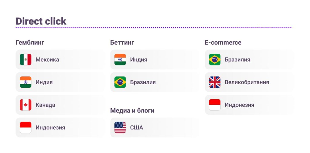 Direct click чаще всего применяют в гемблинге, беттинге, e-commerce и медиа-проектах, где решение принимается быстро и не требует сложного прогрева.