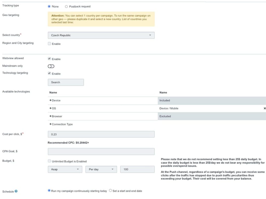 Мы сразу решили запускаться только на мобилках. Почему? Потому что у рекламодателя уже был опыт с пуш трафиком для казино офферов, и он точно знал, что это сработает. Никаких сложных настроек таргетинга, разделения по ОС и браузеру – просто мобильный трафик с пушей.