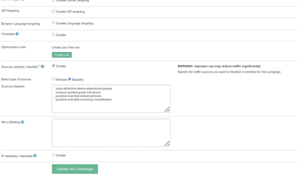 - Фильтрация трафика: специально-собранный вайтлист от сетки ROIads.