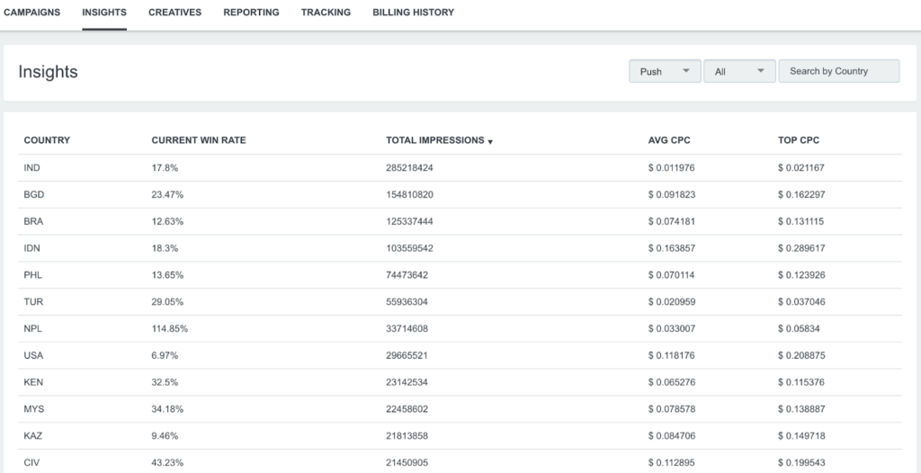 Push-трафик и попандер-трафик стоят дешевле, чем нативная или медийная реклама, но конкуренция очень высока, особенно в прибыльных гео. Не забывайте, что вы участвуете в аукционе, а значит, нужно ставить на уровне, чтобы получить качественный траф.
