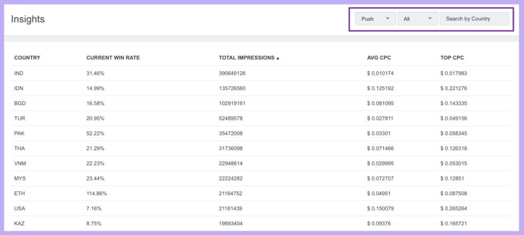 После регистрации в ROIads вы получите доступ к Insights Tab по 150+ гео, включая объемы трафика, средние и топовые CPC/CPM ставки, win rate и распределение по типам трафика (мобильный или десктоп).