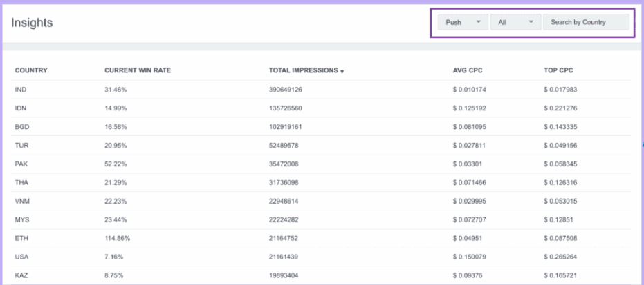 После регистрации в дашборде доступны данные по более чем 150 ГЕО, включая доступные объемы трафика, средние и максимальные ставки CPC/CPM, статистику win rate, а также сегментацию по форматам и типам трафика (desktop или mobile).