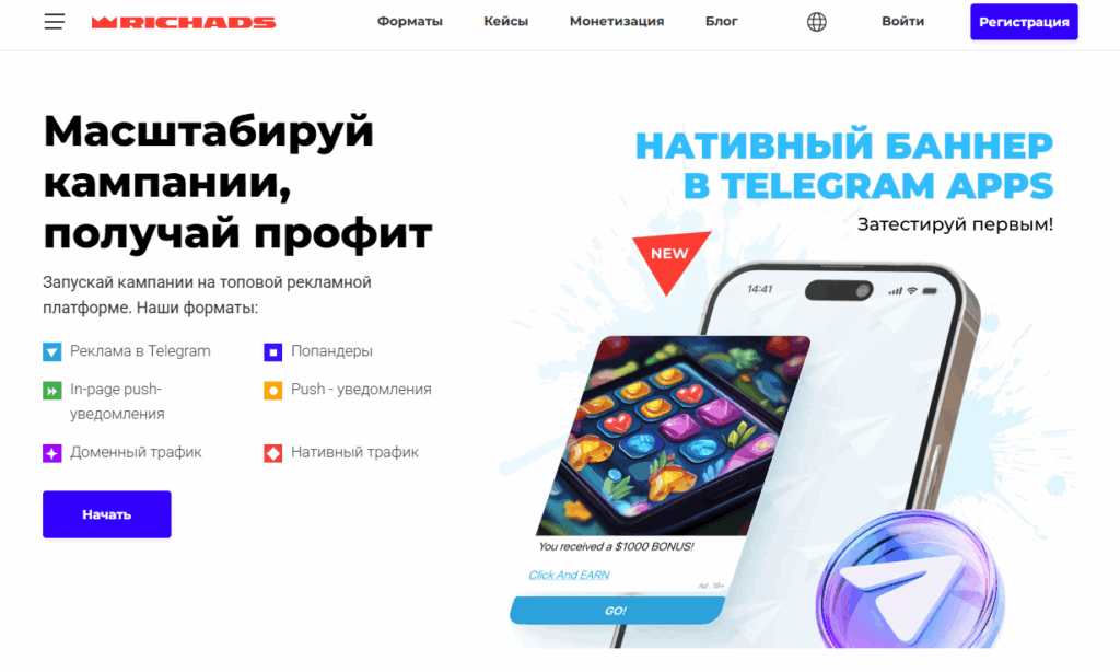 | RichAds | Пуш, In-Page Пуш, Попандер, реклама в Telegram, Direct Click, Нативная реклама | $100 | Target CPA, автоматизация, верифицированный трафик |