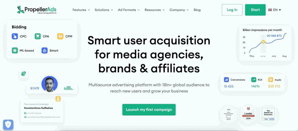 PropellerAds is one of the biggest ad networks around — and a lot of affiliates love them because they can get huge volume of traffic with automated optimization. They cover almost every country under the sun and they’ve got ad formats that perform well in just about any niche. They’re known for delivering stable campaigns and making it super easy to get started, which is why they’re a popular choice for testing new offers.