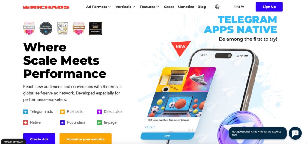 - Formats: Telegram Mini Apps, Push Notifications, In-Page, Interstitial, Popunder, Survey Exit.