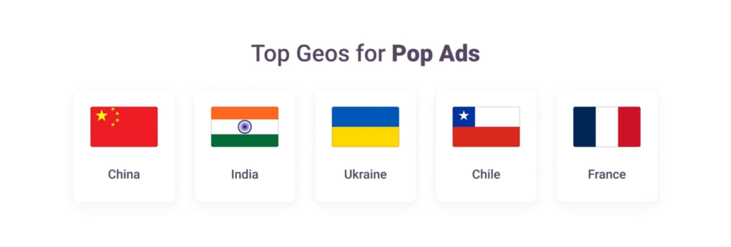Best performing geos for popunder traffic are India, Indonesia, Brazil, China and Ukraine. These regions have high traffic, high engagement and competitive bid prices so you can scale your campaigns.