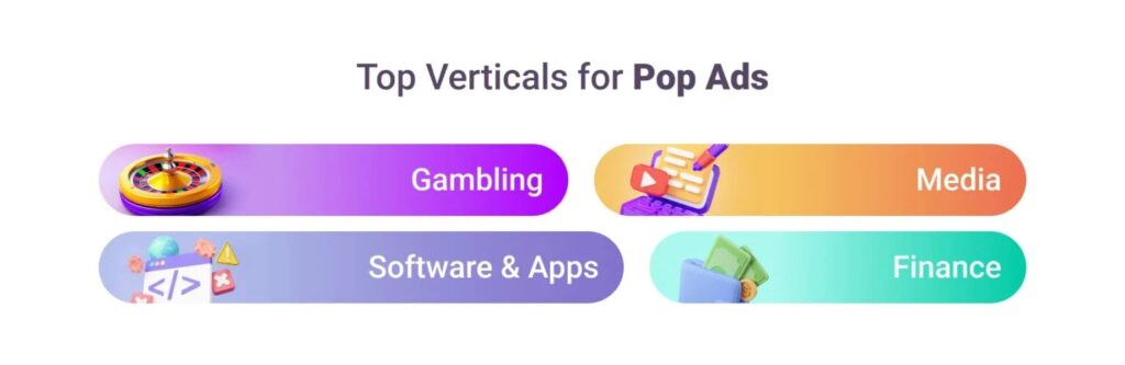 Popunder traffic is good for verticals that need mass reach and quick user actions. The strongest niches are Gambling, Betting, Software & Utilities, Dating and Finance. Gambling and betting campaigns get instant engagement, utilities and software offers get high install rates, dating gets broad coverage and finance gets exposure to get leads and conversions.